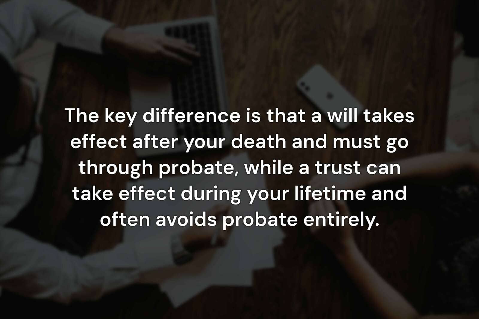 A will and a trust are both estate planning tools, but they serve different purposes and operate in distinct ways. The key difference is that a will takes effect after your death and must go through probate, while a trust can take effect during your lifetime and often avoids probate entirely.