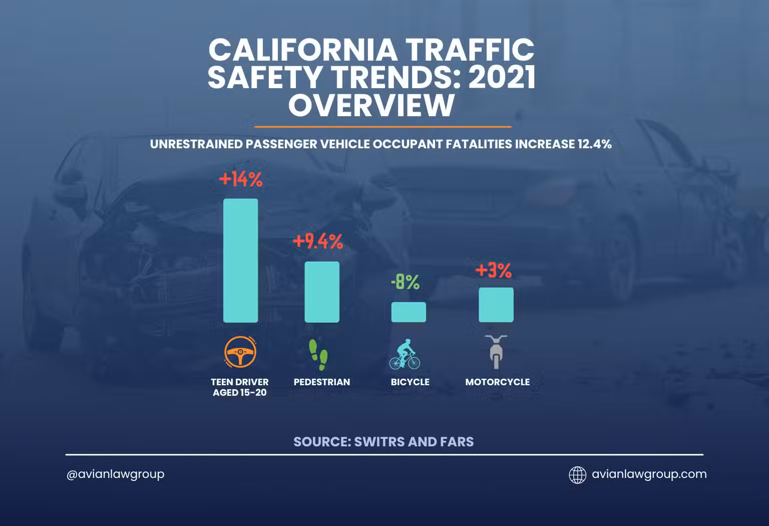 Alcohol-impaired driving fatalities surged by 16% to 1,370 in 2021, up from 1,180 in 2020. Speeding-related incidents, likewise, continue to represent a major portion of traffic accidents in California.