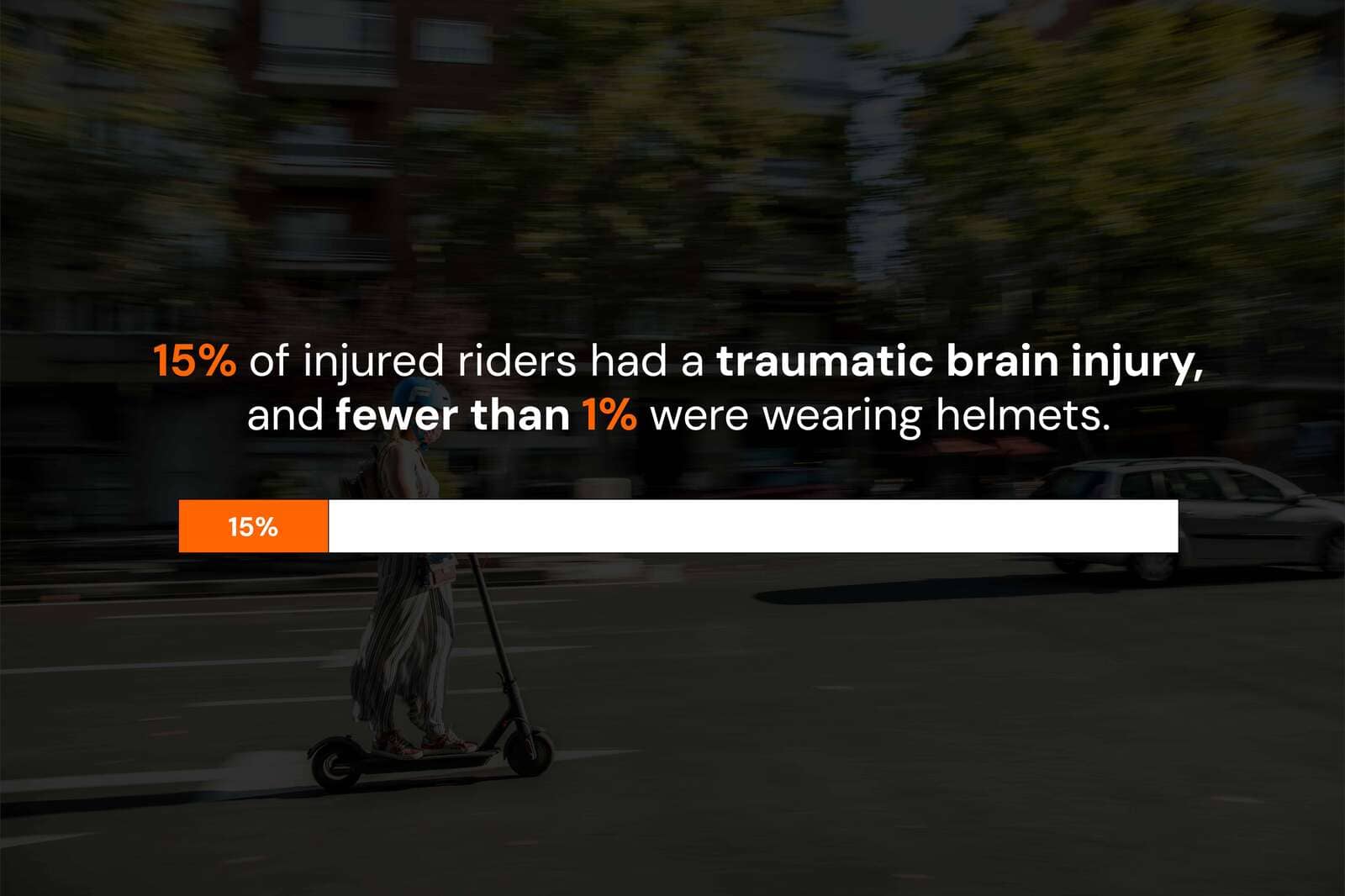 Head trauma and fractures dominate the injury profile. In a CDC–Austin study of dockless scooters, 15% of injured riders had a traumatic brain injury, and fewer than 1% were wearing helmets at the time of the crash (15% TBI; <1% helmeted). Hospitalization patterns echo the severity in larger datasets, with orthopedics and head injuries prominent among admitted cases.