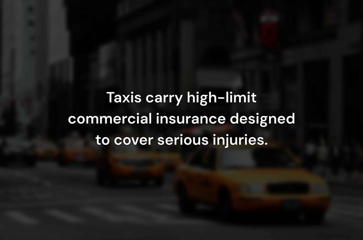 Taxis carry commercial liability insurance ranging from $1 million to $5 million per accident depending on state requirements and company size. This coverage protects passengers, other motorists, and pedestrians injured by taxi driver negligence or company failures.